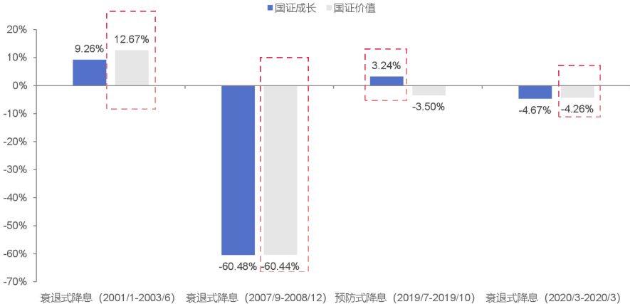 美联储预防式降息或利好成长,美联储衰退式降息或利好价值。根据历史数据来看,2001年以来的美联储四次降息区间中,衰退式降息区间,国信价值指数收益率跑赢国信成长指数;预防式降息区间,国信成长指数收益率跑赢国信价值指数。
