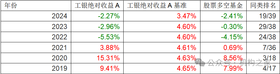 下表是“工银绝对收益A”2019年-2024年的收益率及排名情况: