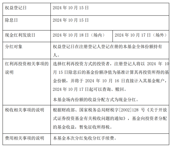 同日,万家中证红利ETF联接基金发布分红公告。根据公告,本次A类分红方案为每10份基金份额派发0.061元,C类分红方案为每10份基金份额派发0.060元,分红权益登记日为2024年10月15日,除息日为10月15日,现金红利发放日为10月17日。