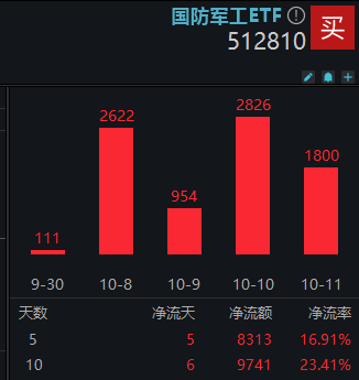 值得关注的是,近日已有资金持续借道ETF加码国防军工板块板块。数据显示,截至10月11日,国防军工ETF(512810)已连续5日获净申购,金额合计超8300万元。