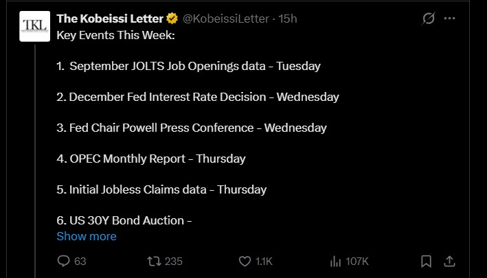 2025年最后一周将发生一系列重要的美国经济事件,包括劳动力数据和一次重要的美联储会议。降息以及能够影响市场走势的报告,这些报告将影响投资者情绪和市场。