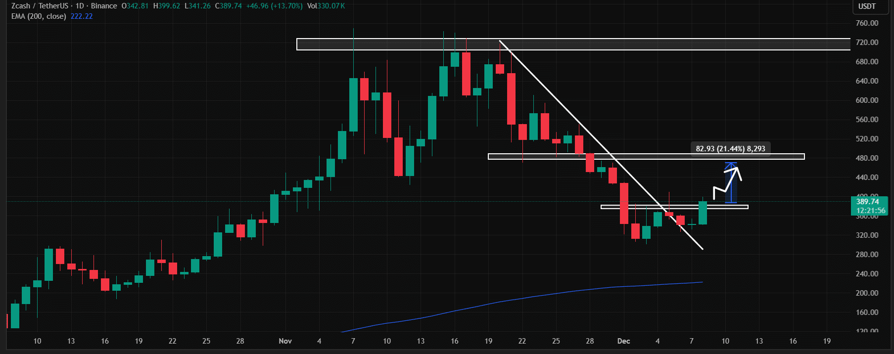 ZEC 连续六个交易日测试了这一水平,但均未能收于其上方。这些反复的受阻导致整体结构疲软。