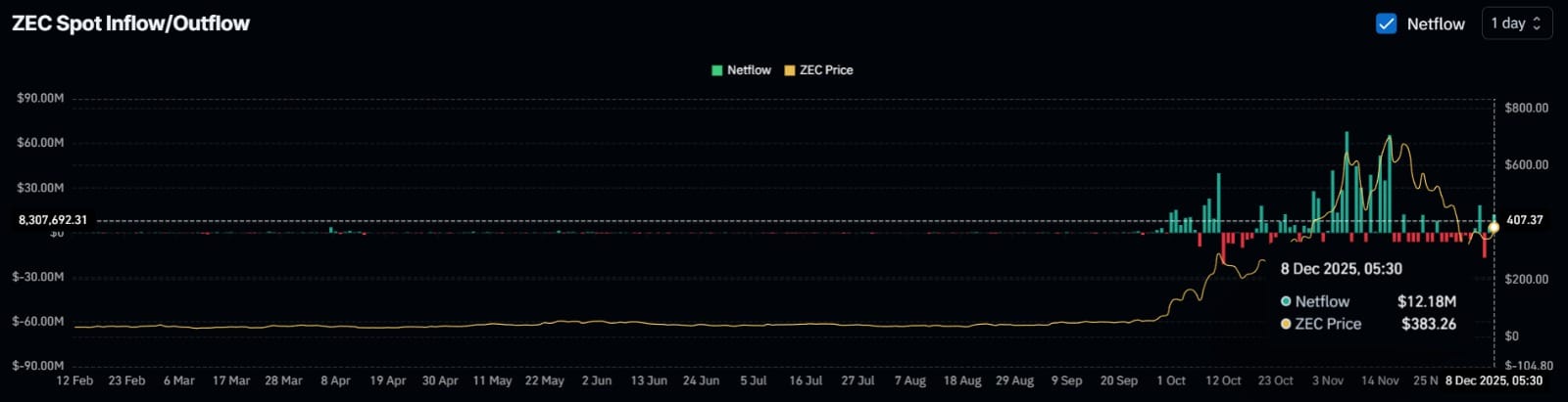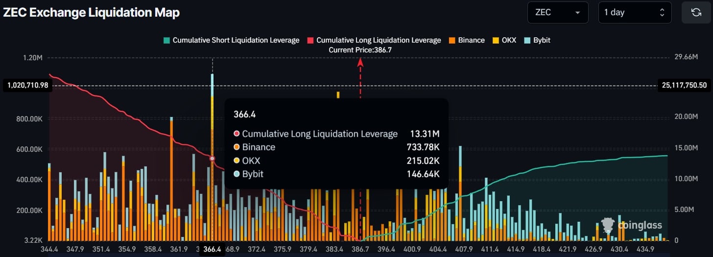 ZEC 的主要清算区域位于下方 366.4 美元和上方 407.4 美元。这些价位构成了衍生品交易者的日内支撑位和阻力位区间。