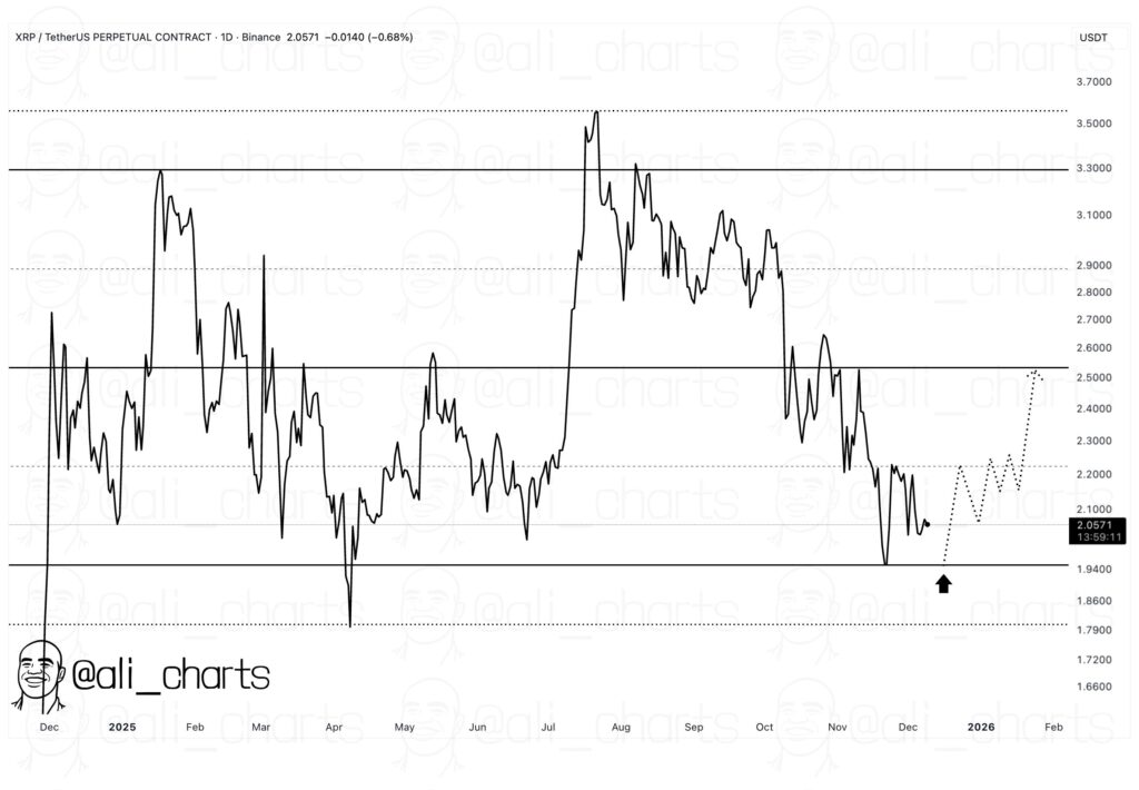 专家绘制的这张 XRP 图表基本描绘了在经历了数月大幅下跌后,价格的一次经典反弹尝试。价格近期触及了 1 美元至 90 美元区域,该区域曾是历史上的重要支撑位,而从该水平的强劲反弹与图表中黑色箭头所示的方向一致。