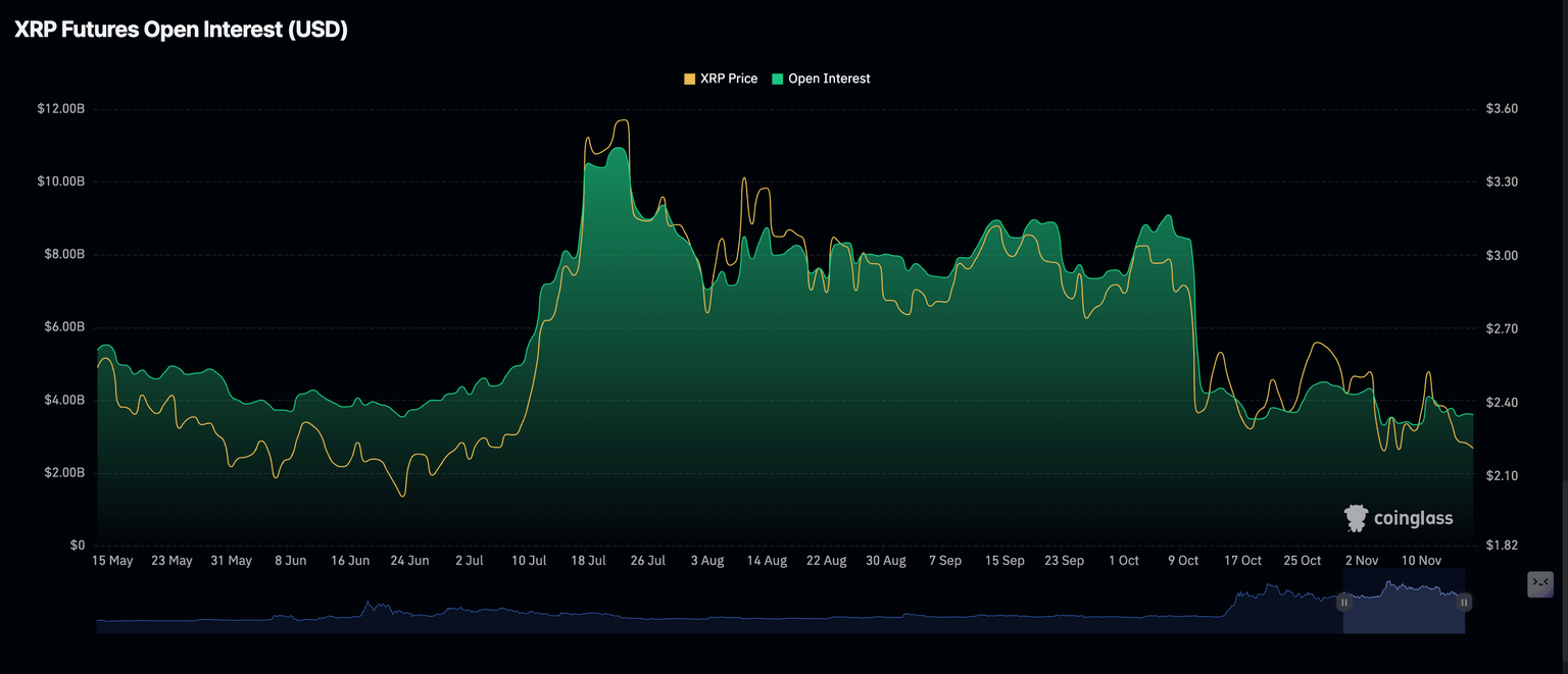 与此同时,自10月中旬以来,XRP的零售需求一直未能复苏,其主要表现是衍生品市场疲软。CoinGlass数据显示,周一XRP期货未平仓合约(OI)平均为36.1亿美元,较前一日的36.3亿美元略有回落,但远低于7月22日创下的109.4亿美元的历史高位。
