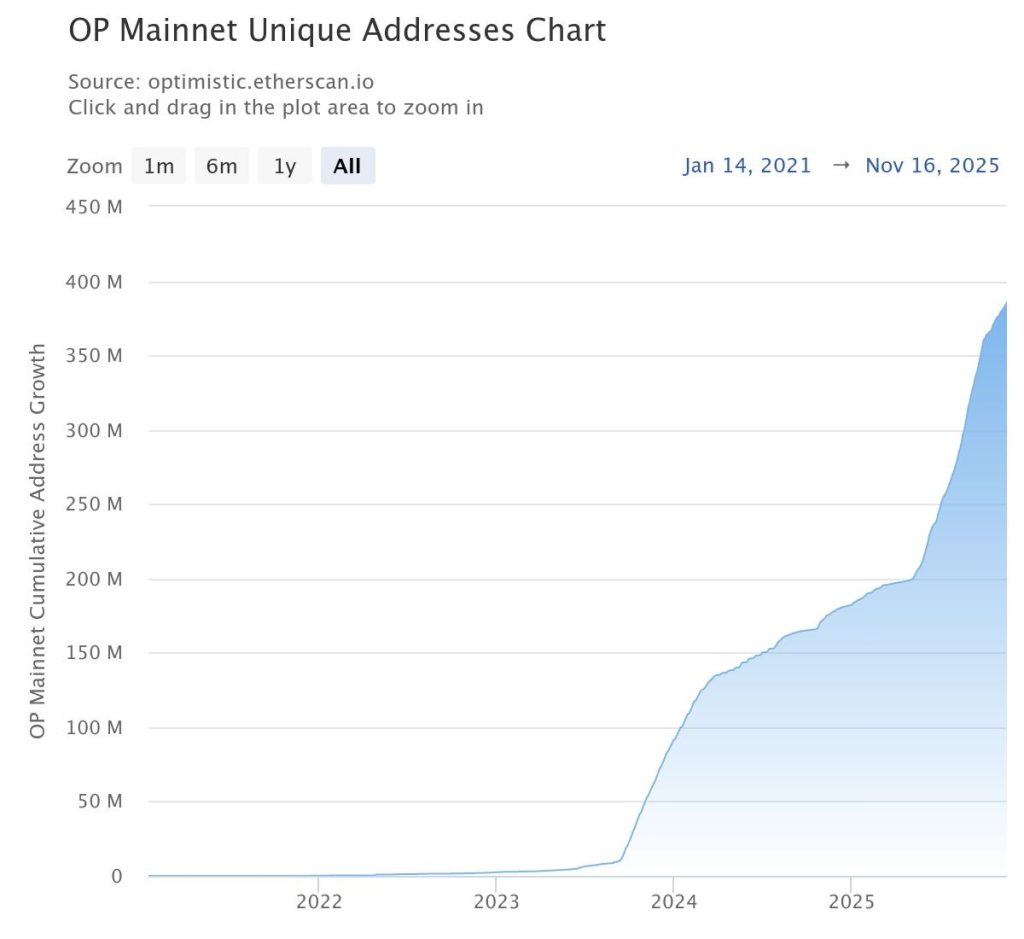 然而,11月带来了一个显著的转变。乐观情绪OP 今日价格在楔形下边界附近0.390美元附近盘整,而Optimism OP的市值稳定在7.3777亿美元附近。历史上,该区域曾是价格反弹点,因此当前的市场格局对于任何有意义的Optimism OP 2025年价格预测都至关重要。