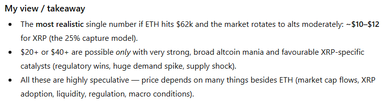 与此同时,ChatGPT得出结论,如果以太坊价格上涨至62,000美元,那么XRP最现实的目标价位在10至12美元之间。ChatGPT还补充道,只有在山寨币市场普遍狂热或出现XRP特有的强劲催化剂(例如需求激增或供应冲击)的情况下,XRP才有可能达到20至40美元的水平。