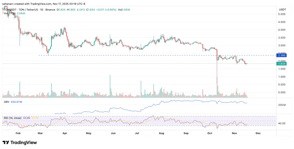 Toncoin 依然是最具韧性的 Layer-1 代币之一,其价格在近期高点附近徘徊,看涨结构依然完好无损。在持续稳定的网络活动和优于同类其他山寨币的强劲流动性支撑下,日线图上的价格持续创出新低。TON 已从主要移动平均线上方强势反弹,表明买家仍在积极守住每一次回调。