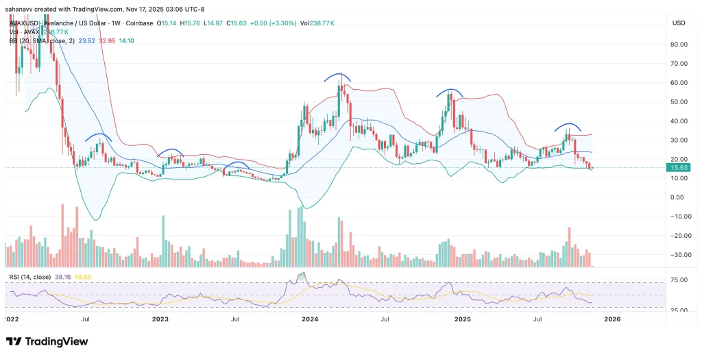 如上图所示,AVAX 价格已触及布林带下轨,通常会引发强劲反弹。周线 RSI 指标此前也接近下轨,但随后出现了看涨背离。此外,从更宏观的角度来看,Chainlink 的价格走势与 2022-2023 年类似。由此看来,AVAX 价格即将触及盘整区间的最低点,随后有望突破 30 美元上方。