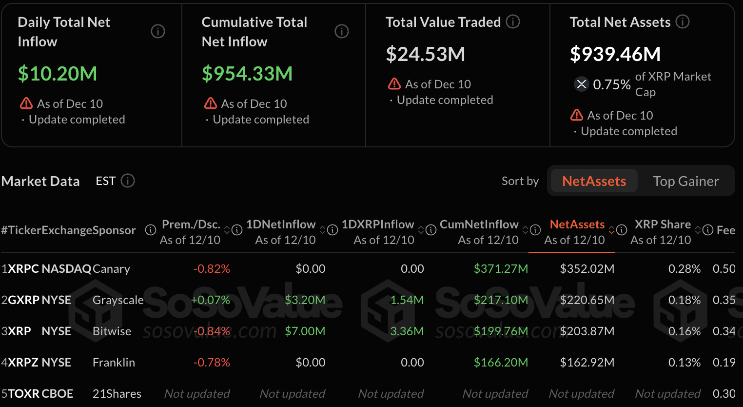 值得注意的是,Gayed创作的这首以XRP为主题的歌曲发布之际,XRP ETF也即将迎来一个重要的里程碑。截至最近一次交易日,XRP ETF累计净流入资金达9.54亿美元。仅昨日一天,这些产品就吸引了1020万美元的新投资,其中Bitwise投资700万美元,Grayscale投资324万美元。