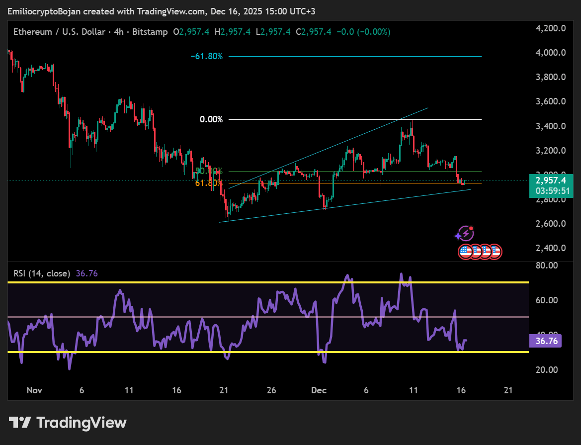 截至发稿时,ETH股价在2957美元附近交易,在大幅抛售后进入盘整阶段。尽管抛售规模较大,但卖方未能立即引发价格暴跌。