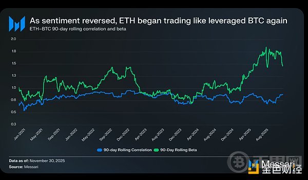 所有这一切,都将 ETH 的争议拉回到其核心矛盾:ETH 或许确实在积累货币溢价,但这种溢价始终滞后于 BTC。市场再次将 ETH 视为 BTC 货币叙事的杠杆化表达,而非独立的货币资产。2025 年全年,ETH 与 BTC 的 90 天滚动相关性始终在 0.7 至 0.9 之间徘徊,其滚动贝塔系数(beta)飙升至多年高点,有时甚至超过 1.8。如今的 ETH 波动幅度大于 BTC,但仍依赖于 BTC 的走势。