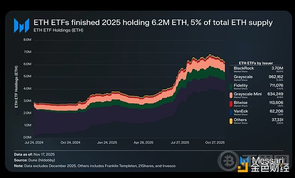 从 ETF 发行方来看,贝莱德延续了其在 ETF 市场的主导地位,2025 年底持有 370 万枚 ETH,占现货 ETH ETF 总市场份额的 60%。这一数字较 2024 年底的 110 万枚增长了 241%,年度增长率超过所有其他发行方。总体而言,现货 ETH ETF 在 2025 年底共持有 620 万枚 ETH,约占 ETH 总供应量的 5%。