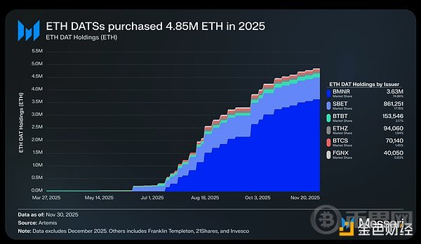 DATs 对 ETH 价格产生了重大影响:2025 年全年累计增持 480 万枚 ETH,占 ETH 总供应量的 4%。其中最活跃的 ETH DAT 是Tom Lee旗下的 Bitmine(BMNR)—— 这家前比特币矿业公司于 2025 年 7 月开始将其库资金和资本转换为 ETH。7 月至 11 月期间,Bitmine 累计购买了 363 万枚 ETH,以 75% 的 DAT 持仓占比,成为该领域无可争议的领导者。