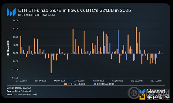 但随着 ETH 的复苏,市场对其 ETF 资金流入的担忧彻底逆转。全年来看,现货 ETH ETF 的资金流入达 97.2 亿美元,而 BTC ETF 为 217.8 亿美元。考虑到 BTC 的市值接近 ETH 的五倍,两者资金流入仅相差 2.2 倍,远低于许多人的预期。换句话说,若按市值调整后,ETH 的 ETF 需求实则高于 BTC—— 这与 “机构对 ETH 缺乏真实兴趣” 的说法形成了鲜明反差。甚至在部分时间段,ETH 的表现完全超越 BTC:5 月 26 日至 8 月 25 日期间,ETH ETF 资金流入达 102 亿美元,超过同期 BTC ETF 的 97.9 亿美元,这是机构需求首次明确向 ETH 倾斜。