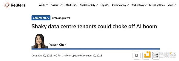 Reuters 和 Bloomberg 在 12 月的连续报道揭开了冰山一角:AI 基建正在快速变成一个“债务密集型行业”。但这只是表象,真正的危机在于深层的金融结构错配——当高折旧的算力资产、高波动的矿工抵押物,与刚性的基础设施债务被强行捆绑时,一条隐秘的违约传导链已经形成。