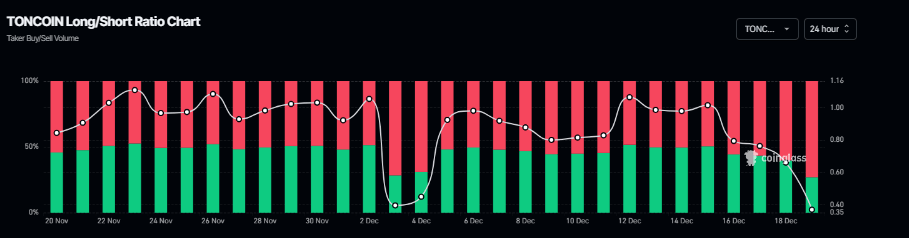 此外,TON的多空比率周五达到0.36,创一个月来新高。该比率低于1表明看跌情绪加剧,因为交易员押注该资产价格下跌。