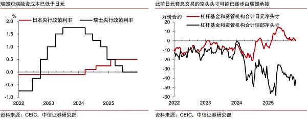 一方面,与去年不同,目前瑞郎的短端融资成本已低于日元、且瑞士央行可能干预汇市促进瑞郎贬值,故日元已不再是全球套息交易首选的融资货币,存量套息交易的日元头寸可能已逐步被瑞郎所承接。