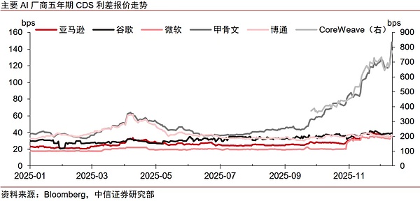 对于美股,市场不时担忧AI叙事的脆弱性,近日甲骨文和CoreWeave的五年期CDS利差显著上升,不过其余多数AI产业链龙头的CDS则仍较稳定,这表明市场对AI泡沫化的质疑可能集中体现于业务模式较激进的少数企业,而财务较稳健的企业仍能获得市场信任。