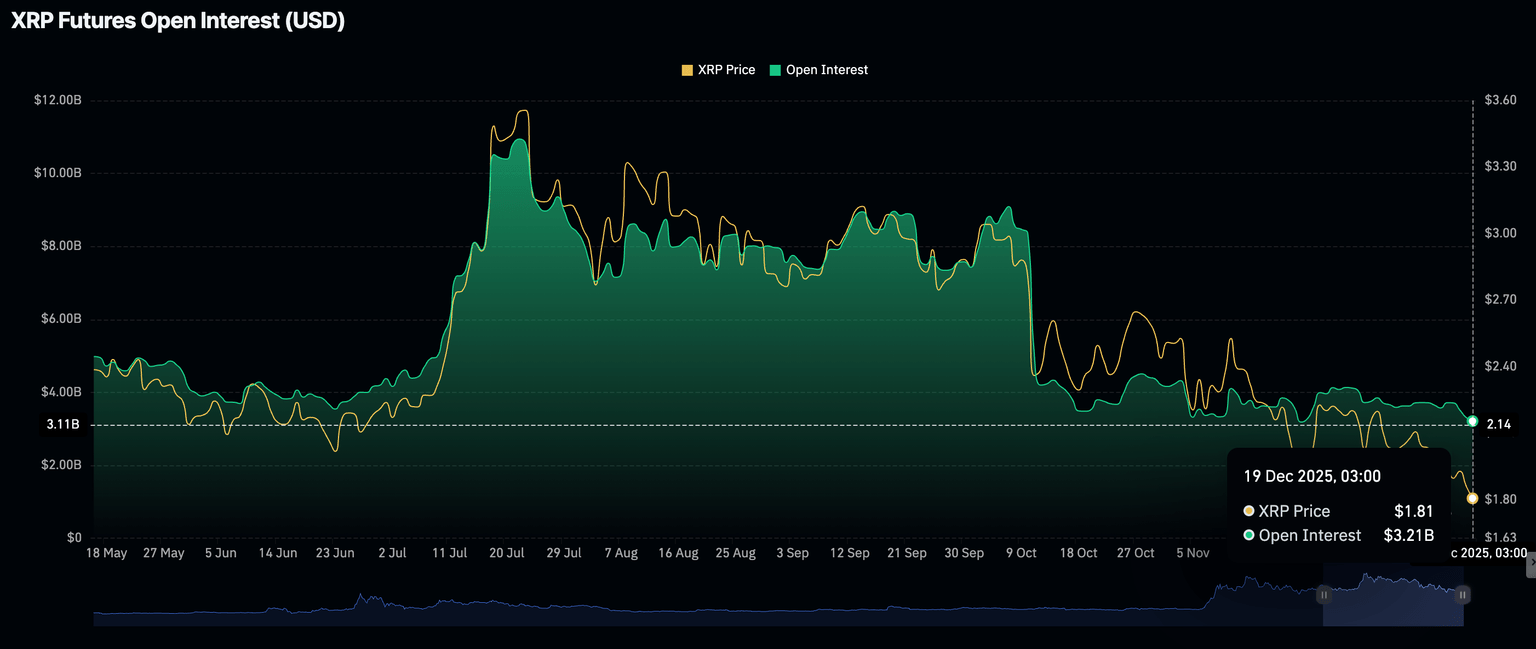 另一方面,XRP 的散户兴趣大幅下降,这对衍生品市场造成了负面影响,并在更大范围内引发了频繁的抛售。CoinGlass 数据显示,周五 XRP 期货未平仓合约 (OI) 为 32.1 亿美元,低于前一天的 33.1 亿美元和周三的 35.2 亿美元。