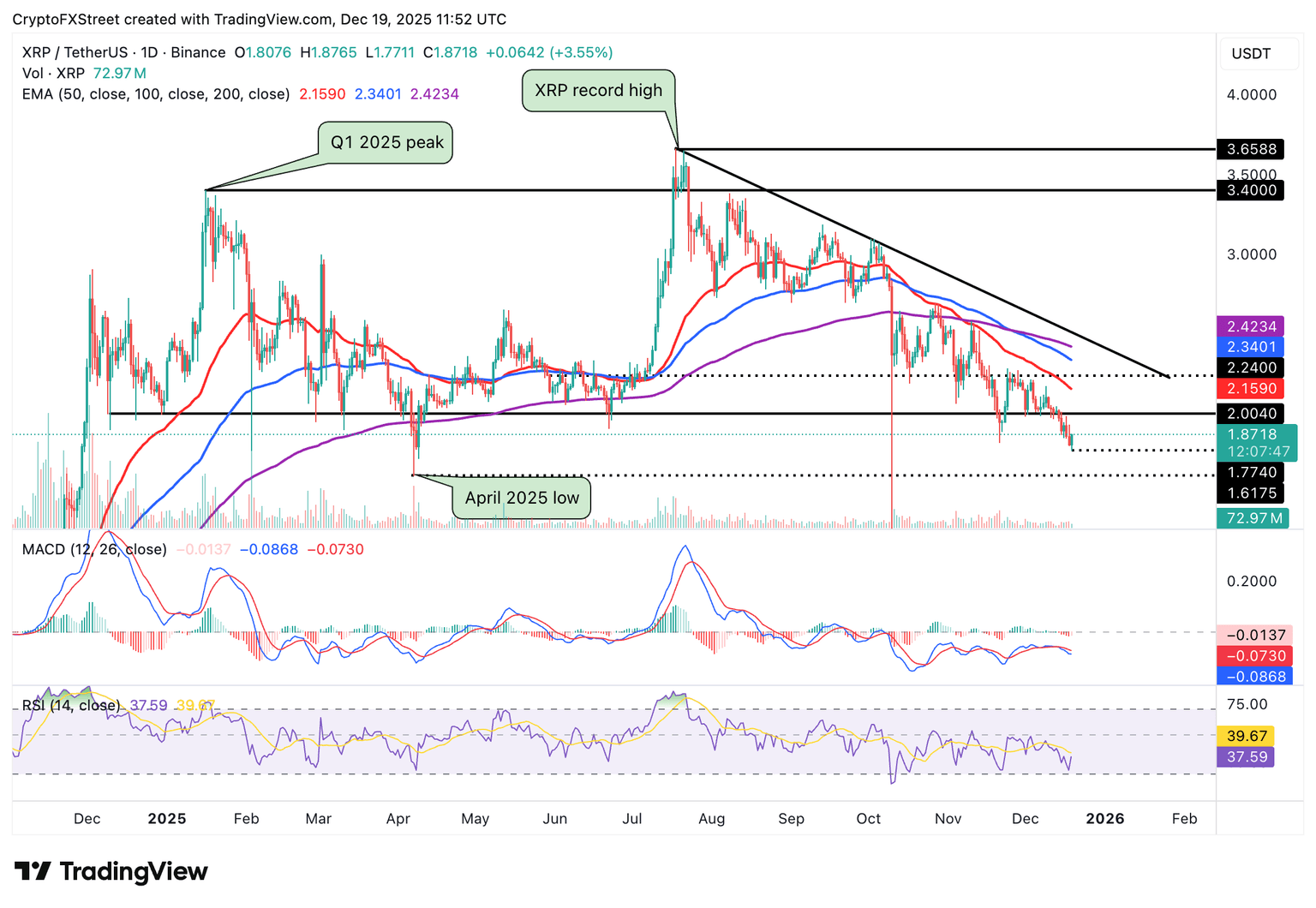 截至周五发稿时,XRP交易价格为1.87美元,日线图上相对强弱指数(RSI)呈上升趋势,目前为37。如果RSI稳步上涨至50中线附近,将确认短期看涨前景,并增加XRP突破关键阻力位2.00美元的可能性。