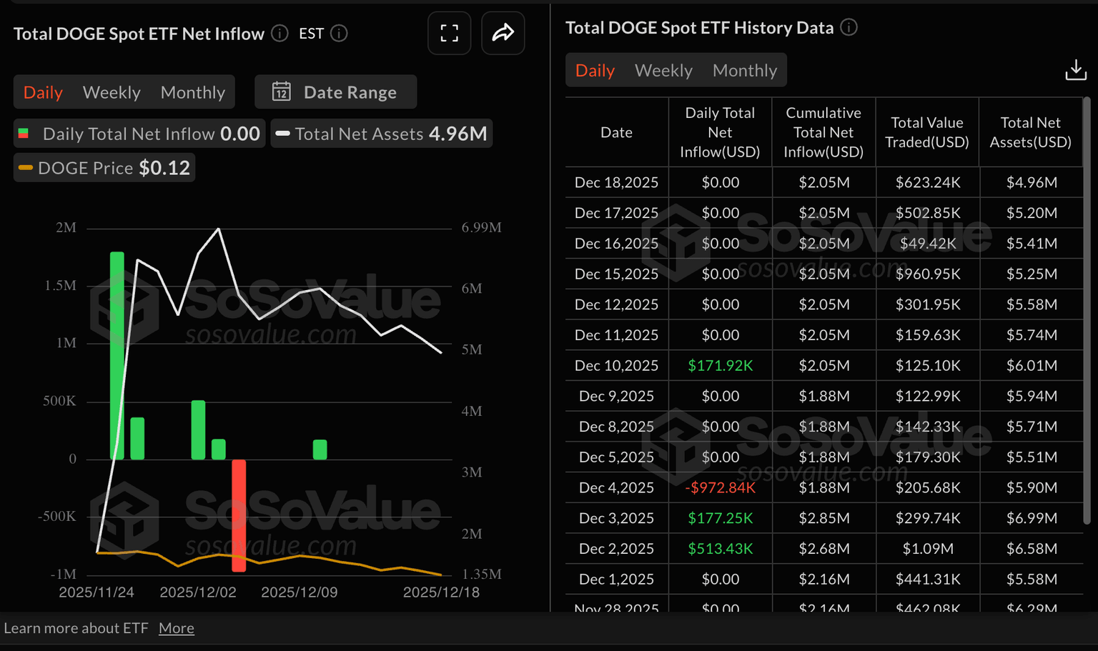 与此同时,机构投资者对狗狗币现货交易所交易基金(ETF)的兴趣明显减弱。根据SoSoValue的数据,自12月10日流入17.2万美元以来,狗狗币ETF就再未录得资金流入。