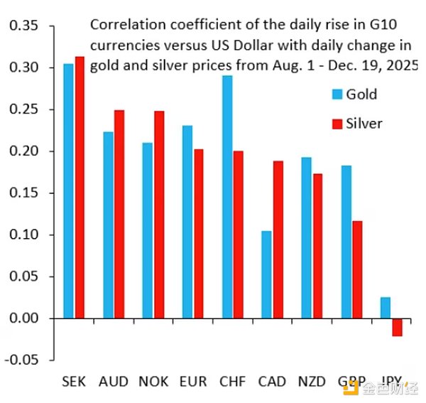 不过他指出,这种“货币贬值交易”并非仅限于贵金属,并强调即使是瑞典克朗、瑞士法郎等债务水平较低的货币,也开始与黄金和白银产生相关性。