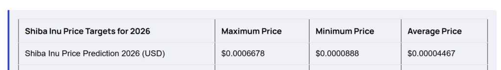 “SHIB 的价格在 2022 年经历了 77% 的大幅下跌(2021 年牛市结束后)。例如,SHIB 在 2022 年初的交易价格为 0.000034 美元,到年底跌至约 0.000008 美元。因此,SHIB 的价格在 2026 年可能会重蹈覆辙,再次出现类似的下跌趋势。然而,SHIB 可以通过推出潜在的新功能、建立合作伙伴关系和制定改进计划来避免此次暴跌。考虑到所有这些因素,我们对 2026 年 Shiba Inu 的价格预测(以美元计)为:最高价 0.0006678 美元,最低价 0.0000888 美元,平均价 0.00004467 美元。”