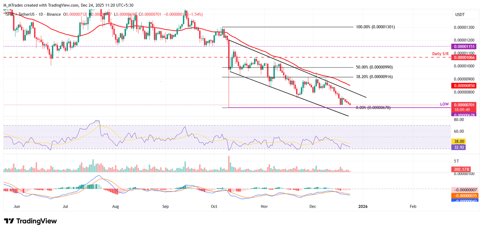 Shiba Inu (SHIB) 价格持续承压,周三跌破 0.000070 美元,看跌势头持续主导整个加密货币市场。链上数据和衍生品数据进一步强化了看跌情绪,而技术分析表明,价格可能出现更深的回调,目标直指年内低点。