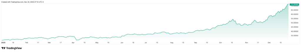白银表现最为突出,1000 美元的投资在接近 72 美元的价格时攀升至约 2480 美元。上涨主要得益于避险资金流入以及与能源转型相关的强劲工业需求。清崎反复争论白银兼具货币和工业的双重作用,因此其上涨潜力比黄金更大,2025 年的价格走势也印证了这一观点。