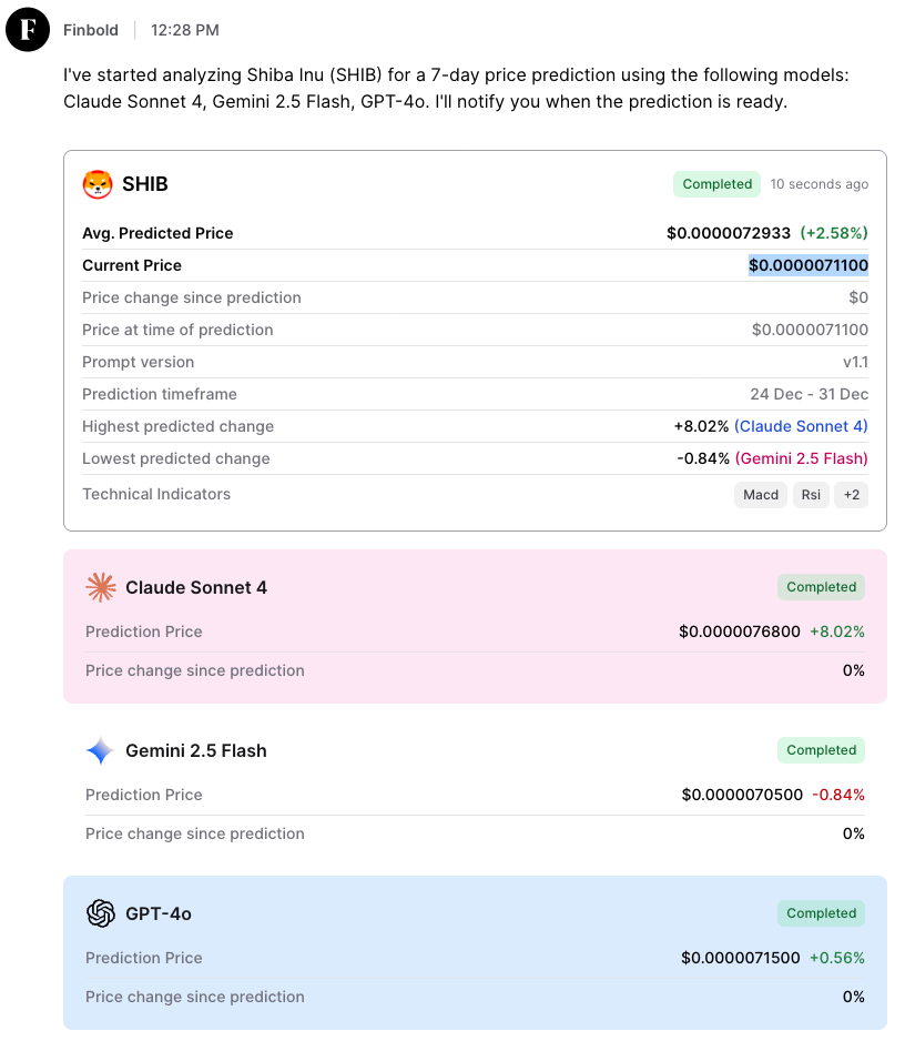 值得注意的是,Finbold AI模型整合了多个大型语言模型的预测结果。其中,Claude Sonnet 4的预测最为乐观,预测SHIB股价将达到0.00000768美元,这意味着上涨空间略高于8%。Gemini 2.5 Flash则给出了更为保守的预测,认为股价将小幅下跌至0.00000705美元,而GPT-4o则预测股价将温和上涨至0.00000715美元。