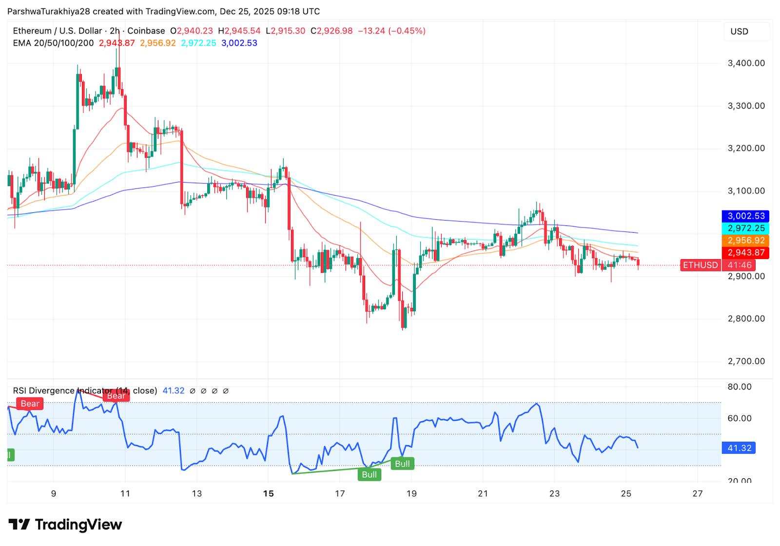 在两小时图上,以太坊持续低于其 20、50、100 和 200 周期指数移动平均线 (EMA)。过去一周,价格多次在 2950 美元至 3000 美元区间内受阻。