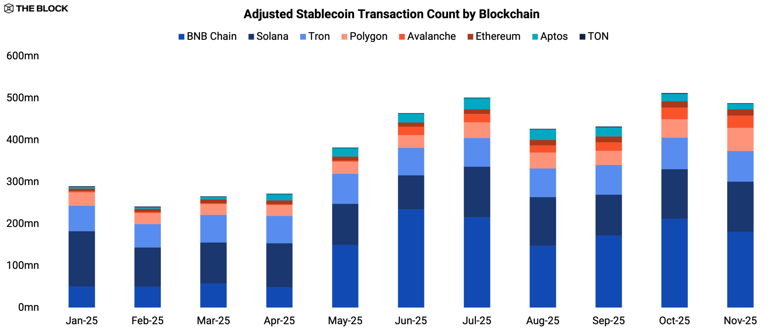 BNB Chain 最显著的优势在于其稳定币交易活跃度。经调整后(剔除机器人和其他人为通胀行为),BNB Chain 的平均交易活跃度超过……1.38亿每月稳定币转账量。推动这一增长的两项举措尤为重要:一是“零手续费嘉年华”,它实现了主流稳定币的免 Gas 费转账;二是 3 月份基于 BNB Chain 平台推出的 World Liberty Financial 的 1 美元稳定币。后者有效地使 BNB Chain 成为这一备受争议、市值数十亿美元的稳定币的主要交易渠道,并将其定位为一个融合了网络迷因、杠杆和支付的混合生态系统。