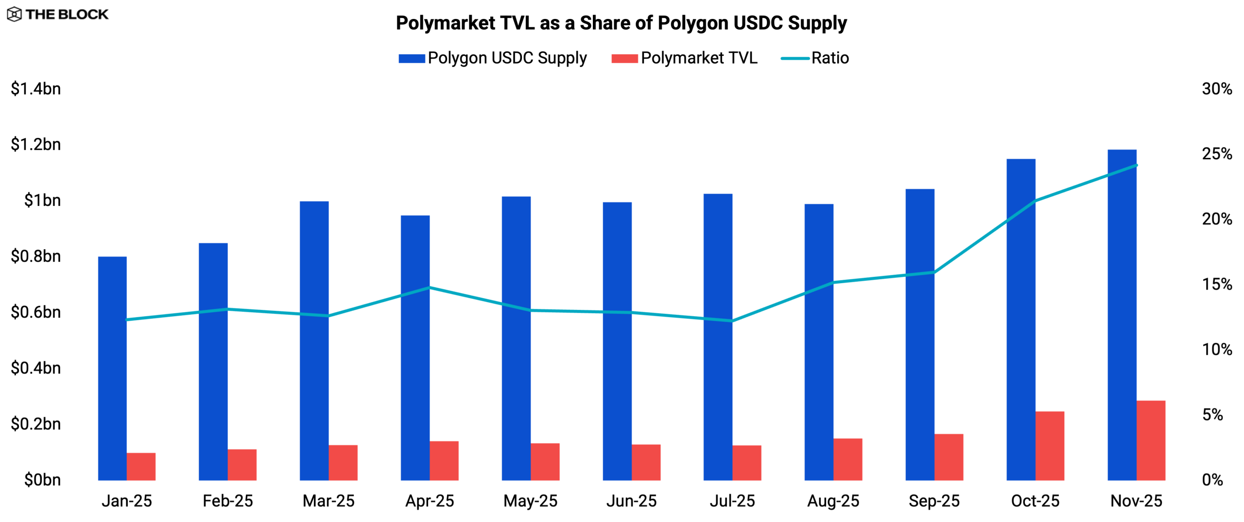 Aptos 和 Polygon 采取了更为机构化的发展路径,其稳定币供应量年初至今分别增长了约 142% 和 76%。在两条链上,10 月份的部署量约为5亿美元BUIDL发挥了举足轻重的作用,约占Aptos净新增发行量的57%,以及Polygon净新增发行量的40%。与此同时,预测市场的重要性日益凸显,这意味着Polygon每日约有14%的USDC供应量锁定在Polymarket合约中。