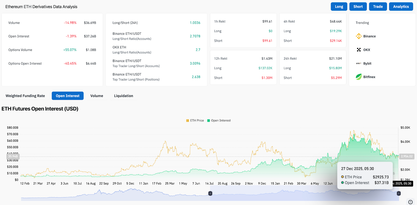 衍生品数据也印证了这种谨慎情绪。以太坊期货未平仓合约量接近373亿美元,当日下跌约1.4%。这一下降反映的是仓位缩减,而非新增杠杆流入市场。