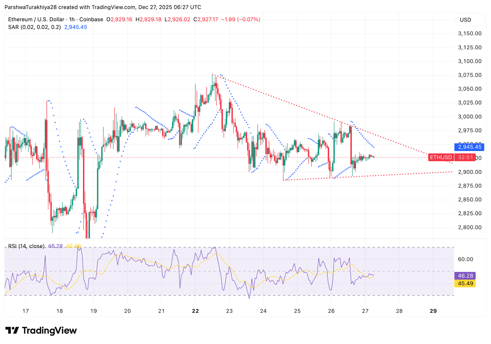 在一小时图上,ETH 价格在 2900 美元至 2980 美元之间收窄区间内波动。抛物线转向指标 (Parabolic SAR) 点仍位于价格上方,维持短期压力,而相对强弱指标 (RSI) 徘徊在 40 左右,反映出动能中性。