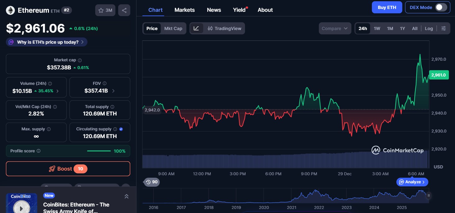 以太坊(ETH)股价为 2961 美元,24 小时内上涨 0.06%,交易量为 101.5 亿美元,市值为 3573.8 亿美元。