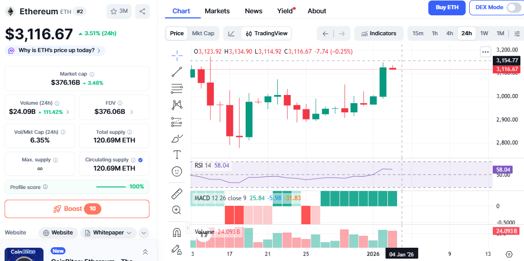 以太坊本身正呈现复苏迹象。过去24小时内,以太坊价格上涨约3.7%,重回3000美元的重要关口。交易图表显示成交量稳定,动能增强,表明买家正在缓慢回归。
