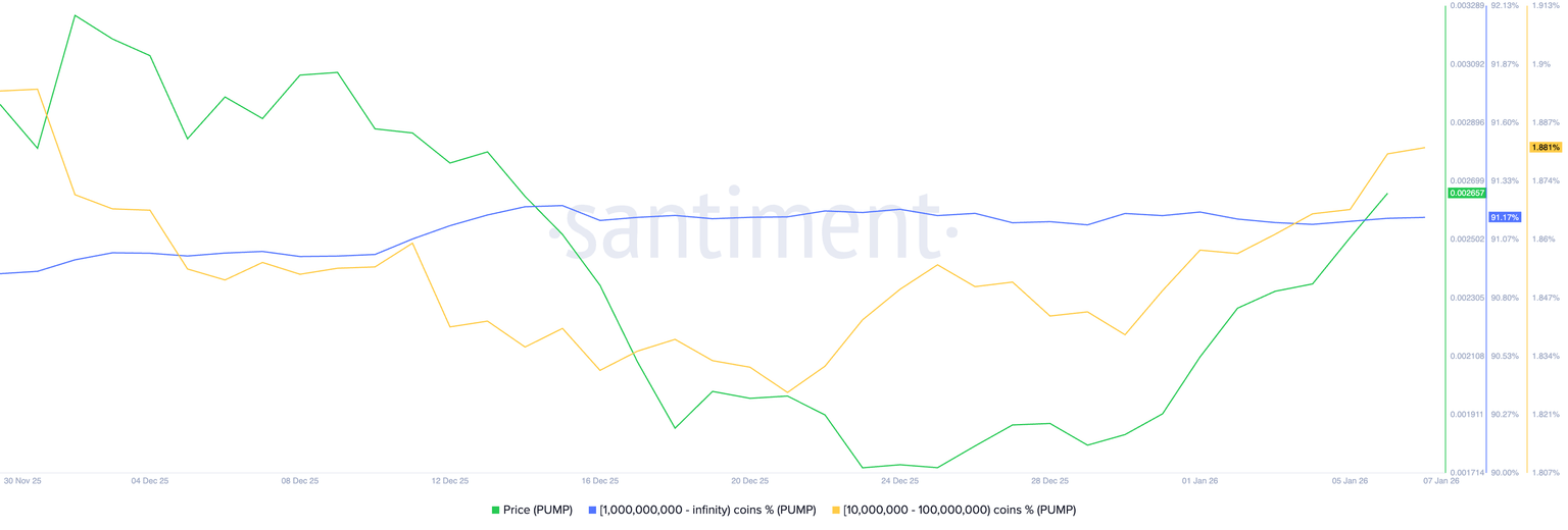 链上数据显示,大型钱包投资者保持稳定,而中型钱包交易活跃度的增加则推动了PUMP价格上涨。据Santiment统计,持有超过10亿枚PUMP代币的持有者掌握了超过91%的链上供应量。