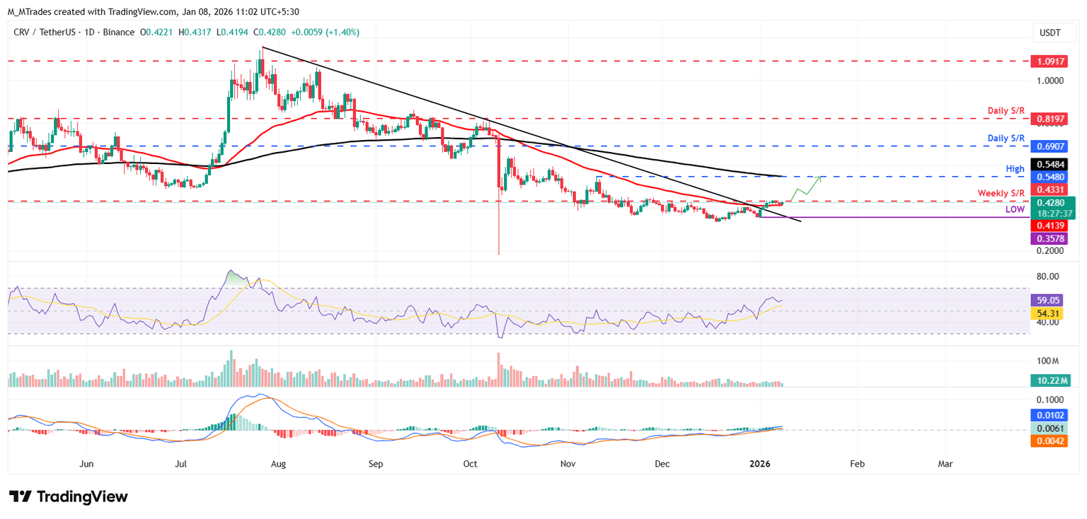 然而,如果 CRV 每日收盘价低于 50 日均线 0.413 美元,则可能会继续下跌,直至触及 1 月 1 日的低点 0.357 美元。
