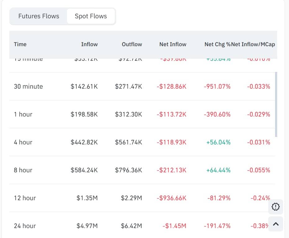 因此,现货净流量暴跌191%至-145万美元,这明显表明现货市场正在积极吸纳资金。资金流出增加通常会减少流通中的供应量,进一步缓解市场压力。