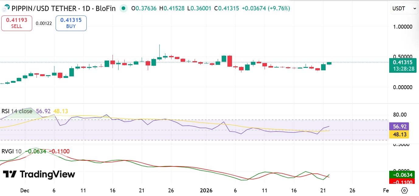 截至发稿时,PIPPIN 股价为 0.412 美元,日线图显示上涨 27.57%。同期,其成交量增长 21% 至 5650 万美元,市值增长 25% 至 3.88 亿美元。