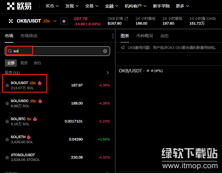 在欧意界面,顶部导航栏选择交易板块,进入“现货交易”板块,搜索“SOL/USDT”交易对;