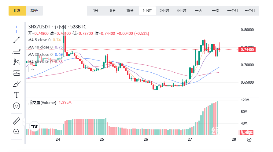 截至2025年8月,SNX的市场价格为0.74美元,市值约2.6亿美元。其价格表现与DeFi整体市场活跃度、合成资产交易量及协议抵押率密切相关——当市场对合成资产需求上升时,SNX的质押需求增加,可能推动代币价格上涨;反之,若DeFi市场遇冷或协议出现安全风险,SNX价格也可能承压。
