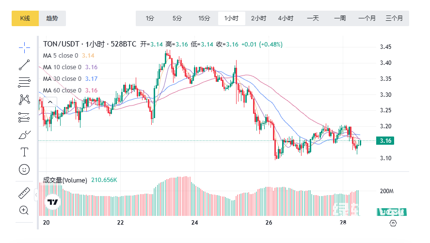 截至2025年8月,TON的价格约为3.16美元,市值达80.8亿美元,位列全球加密资产第22名。其流通量为25.6亿枚,代币总量无硬顶,年通胀率约3%,这种通胀模型主要用于激励网络节点和生态建设。此外,与币某安合作上线现货交易对后,其市场流动性得到显著提升。