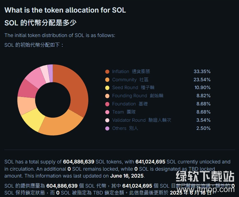 SOL币初始代币分配中,33.35%用于通胀发行,23.54%分配给社区,早期用户与团队占比约30%。这种设计平衡了长期扩展与早期激励。当前流通量超5.35亿枚,总供应量6.04亿枚,通胀发行持续缓释,避免短期流动性冲击。