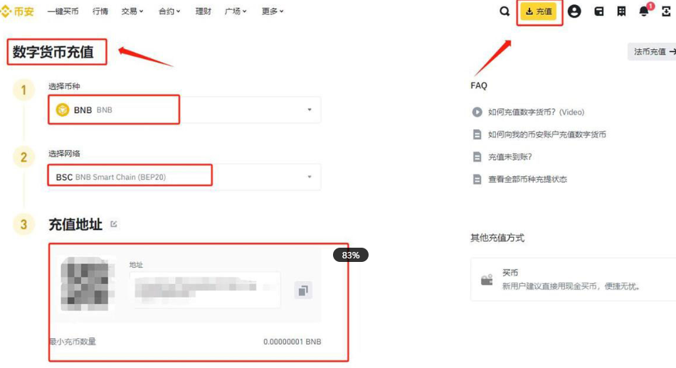 进入币某安交易所,依次点击“资产"-"充值”-“充值加密货币”,选择网络为“BSC”点击复制BNB充值地址。