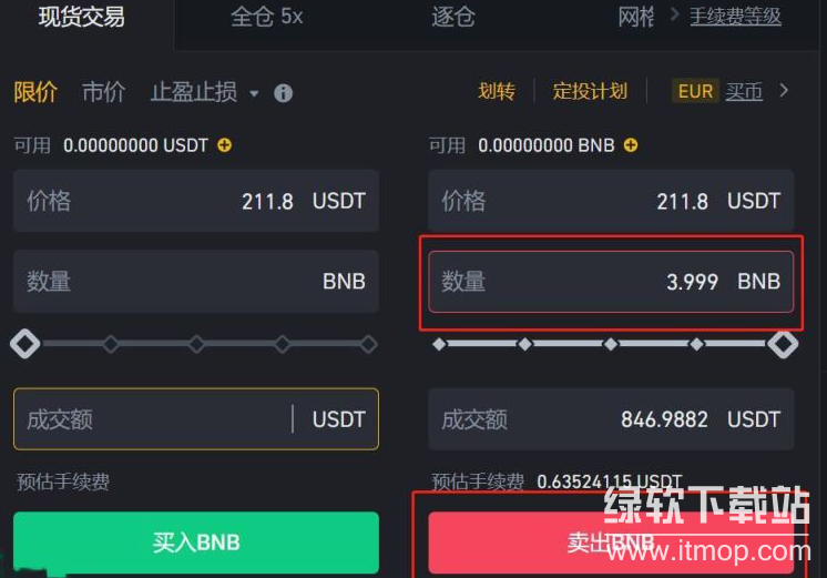 搜索币种简称【BNB】,选择【BNB/USDT】交易对,填写卖出数量,点击【卖出BNB】置换成USDT。