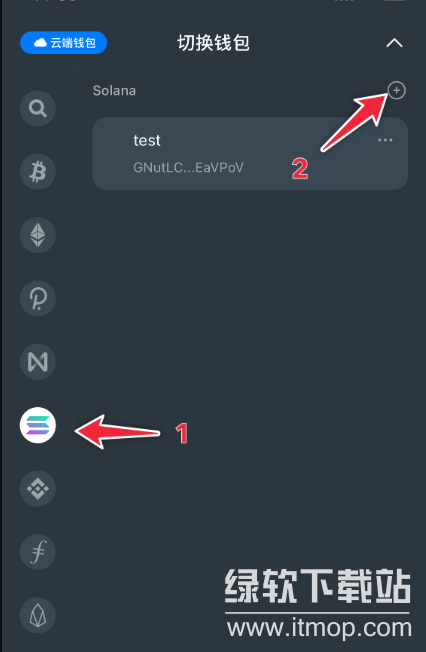 麦子钱包安装完成后,进入切换钱包界面,左侧选择 Solana 公链,然后点击右上角 号。