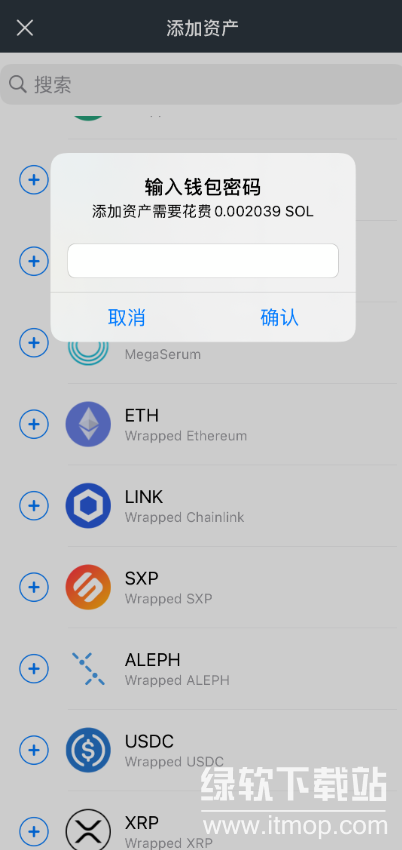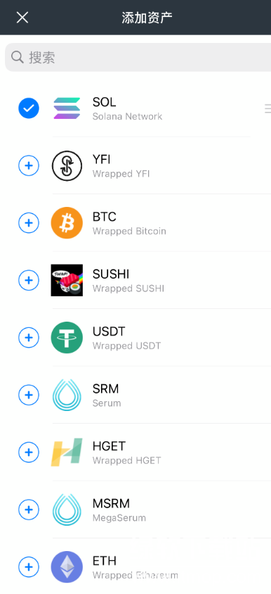 在下方币种列表,根据需求选择你需要的资产,点击 号。